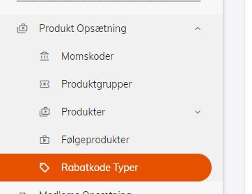 - Vælg Produkt Opsætning > Rabatkode-typer i menuen til venstre.