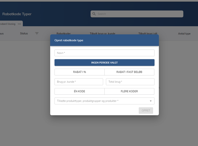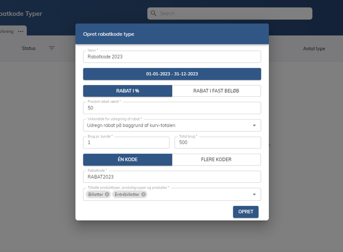 For at kunne gør brug af rabatkoder, skal man først oprette en rabatkode-type. En rabatkode vil aldrig kunne give en negativ kurv-total, og vil derfor ikke kunne bruges til at give penge tilbage til kunden