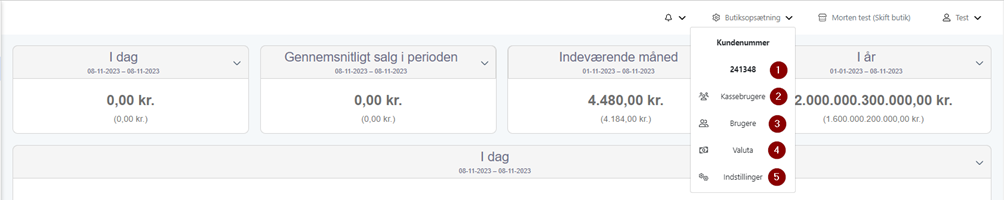 Butiksopsætning ligger i toppen af siden som en dropdown menu, denne kan variere ift. Din kasseløsning.