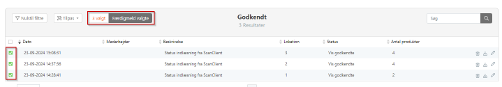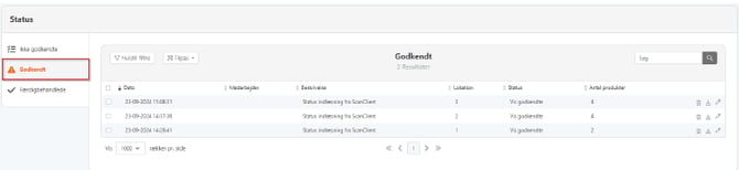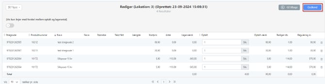 Når du er færdig med at tilføje stregkoder manuelt, eller redigere i fx antallet af scannede produkter, så tryk på Godkend i toppen af listen.