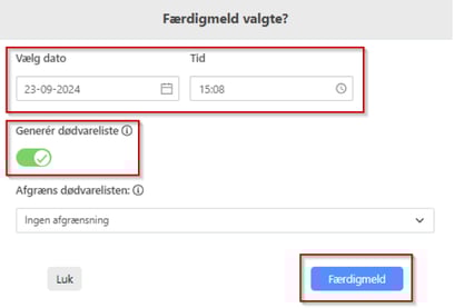 Nu kommer der en boks frem, hvor du kan vælge dato og tidspunkt for, hvornår du ønsker at færdigmelde din statusoptælling.