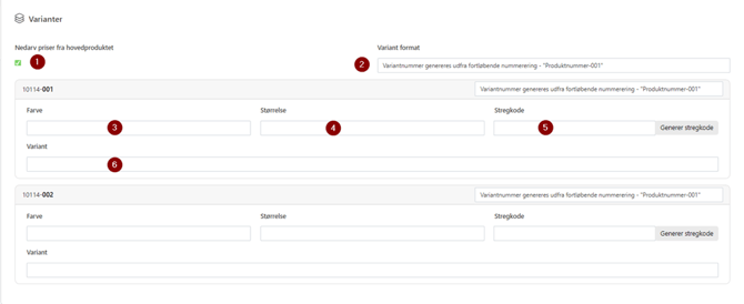 Varianter oprettes som underprodukter til det oprettede produkt og bruger produktnummer samt navn.