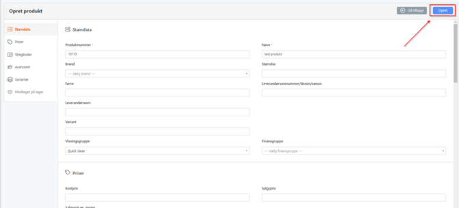 Du kan nu trykke på den blå opret knap så vil varen være oprettet i FlexPOS Back Office.