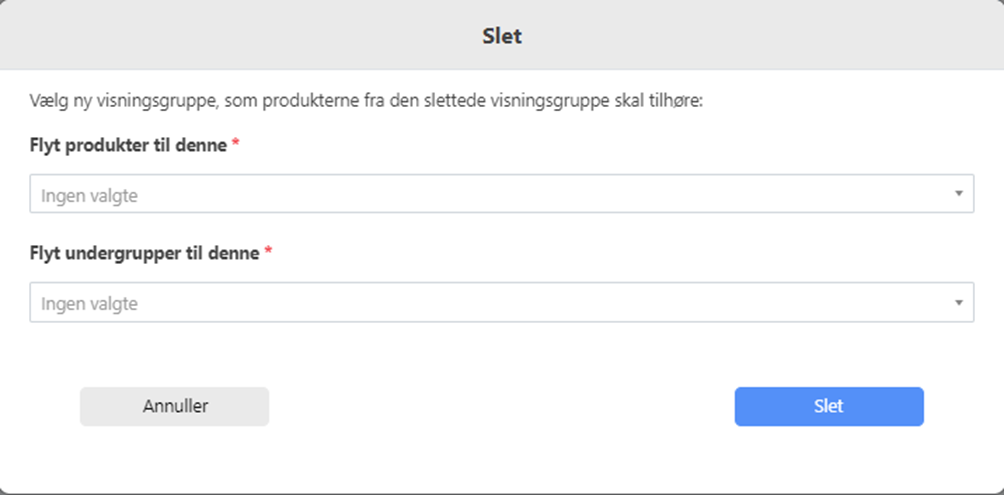 - Flyt produkter til denne: flyt produkter til en anden visningsgruppe som er valgt, dette er et krav.